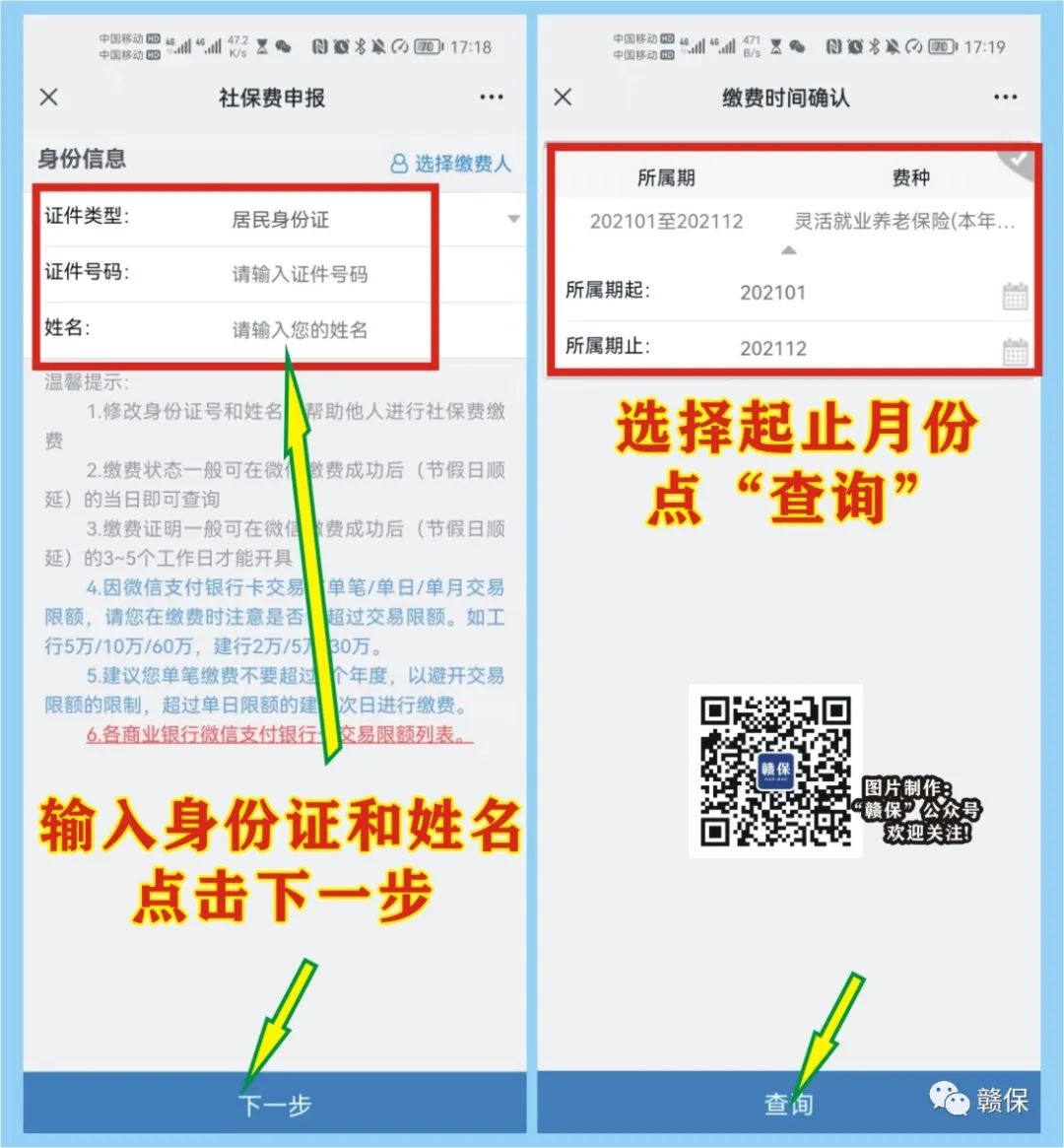 第三步:输入身份证和姓名,点击“下一步”,然后,选择起止月份。比如您是交一整年,则“所属期起”选“202101”,“所属期止”选“202112”。