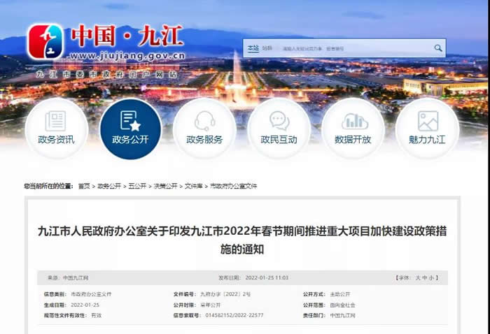 九江市2022年春节期间推进重大项目加快建设政策措施