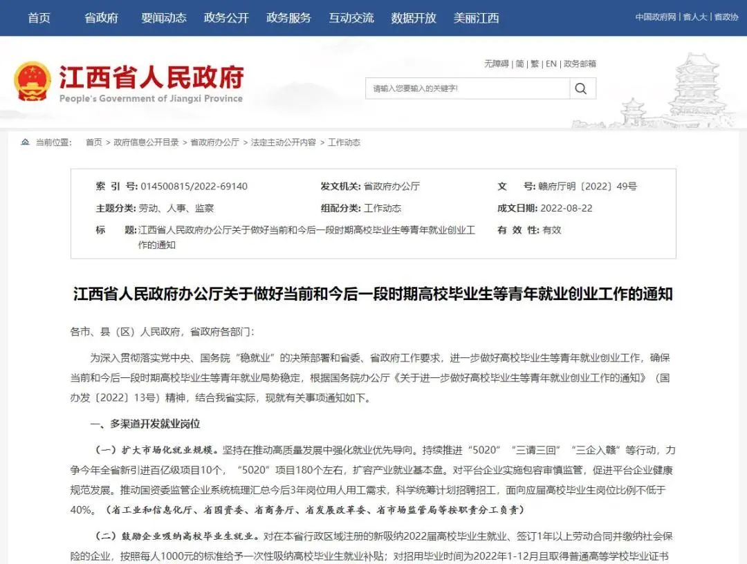 近日,江西省人民政府办公厅印发《关于做好当前和今后一段时期高校毕业生等青年就业创业工作的通知》,对青年就业创业工作作出部署。关于找工作、找实习、自主创业、灵活就业,有哪些好消息?一起来看!