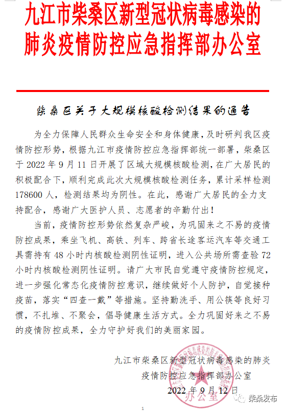 为全力保障人民群众生命安全和身体健康,及时研判我区疫情防控形势,根据九江市疫情防控应急指挥部统一部署,柴桑区于2022年9月11日开展了区域大规模核酸检测,在广大居民的积极配合下,顺利完成此次大规模核酸检测任务,累计采样检测178600人,检测结果均为阴性。在此,感谢广大居民的全力支持配合,感谢广大医护人员、志愿者的辛勤付出!