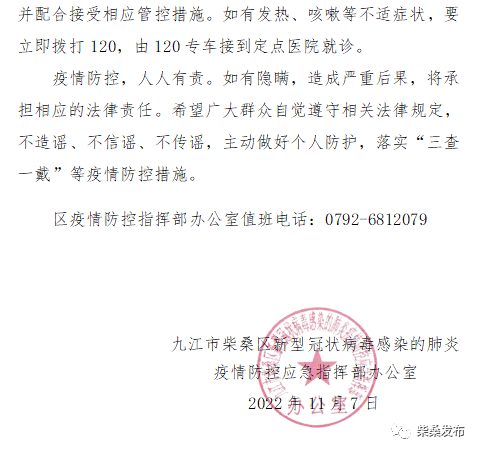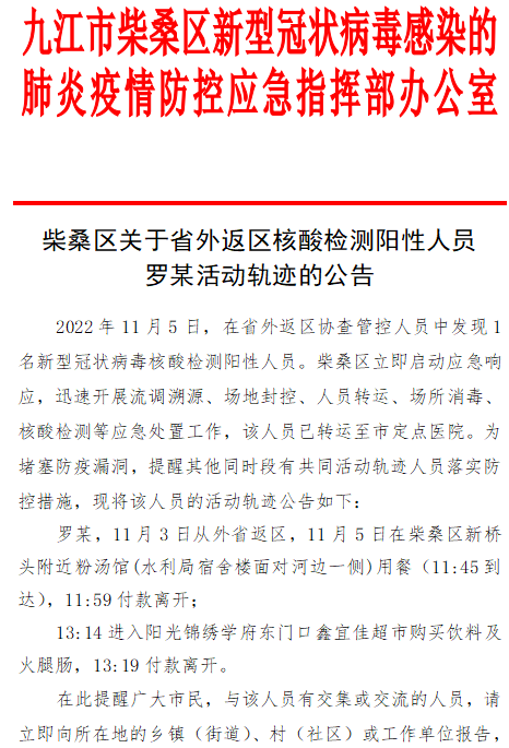 柴桑区关于省外返区核酸检测阳性人员罗某活动轨迹的公告