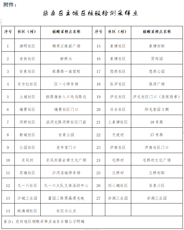 三、采样地点:主城区核酸采样点见附表,各乡镇核酸采样点由各乡镇公示。