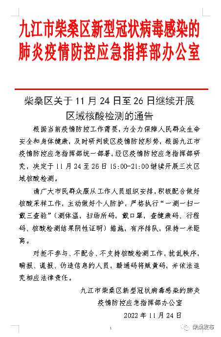 柴桑区关于11月24日至26日继续开展区域核酸检测的通告