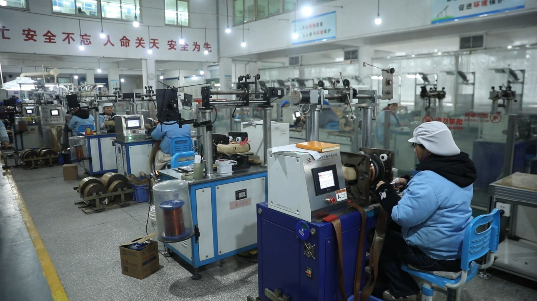 走进企业生成车间,自动化设备高速运转,工人们各司其职,熟练进行绕线、装配、检测等工序,呈现一派繁忙有序的生产景象。