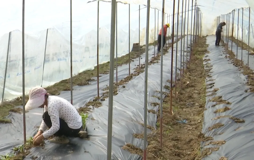 在合作社的种植大棚里,黑色地膜整齐铺展,工人们分工协作、熟练移栽西瓜苗。一株株嫩绿的瓜苗错落有致、生机盎然,连片大棚孕育着增收致富的新希望。