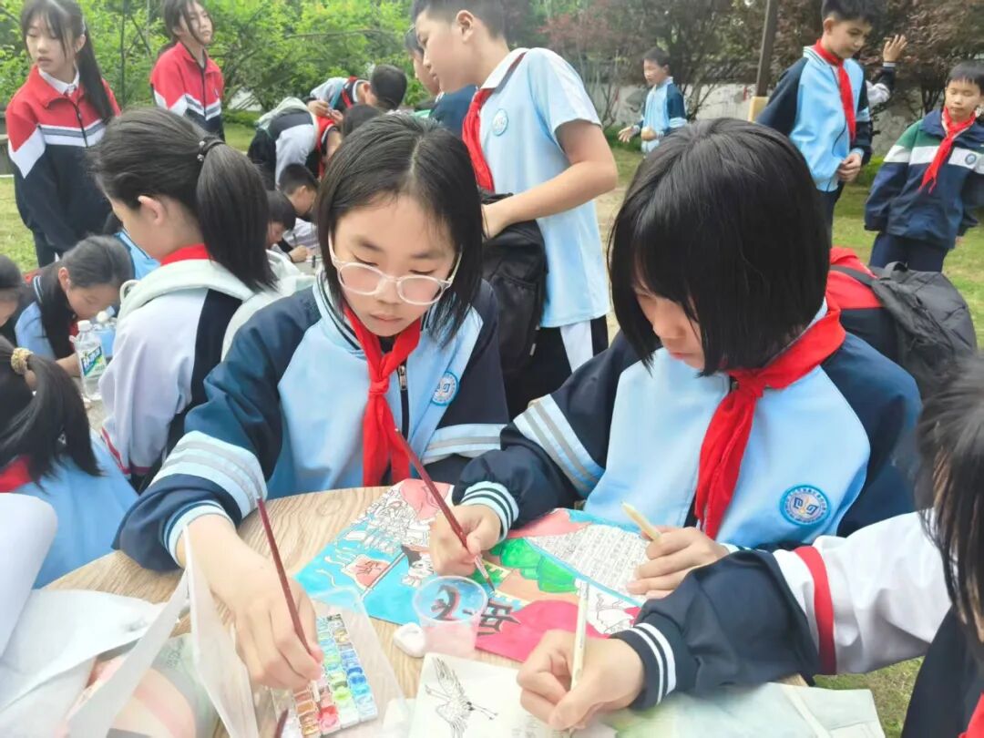 活动中,各班开展爱国诗词诵读展演。学生们精神饱满、声情并茂,以铿锵之声致敬民族英雄。全体师生在讲解员带领下,有序参观岳母祠、孝庐等人文点位,聆听岳母刺字故事,了解岳飞忠孝报国的一生,在实景中感悟“精忠报国”的精神内涵。研学过程中,同学们还制作爱国主题书签、手绘文创作品,以实际行动表达爱国之情。